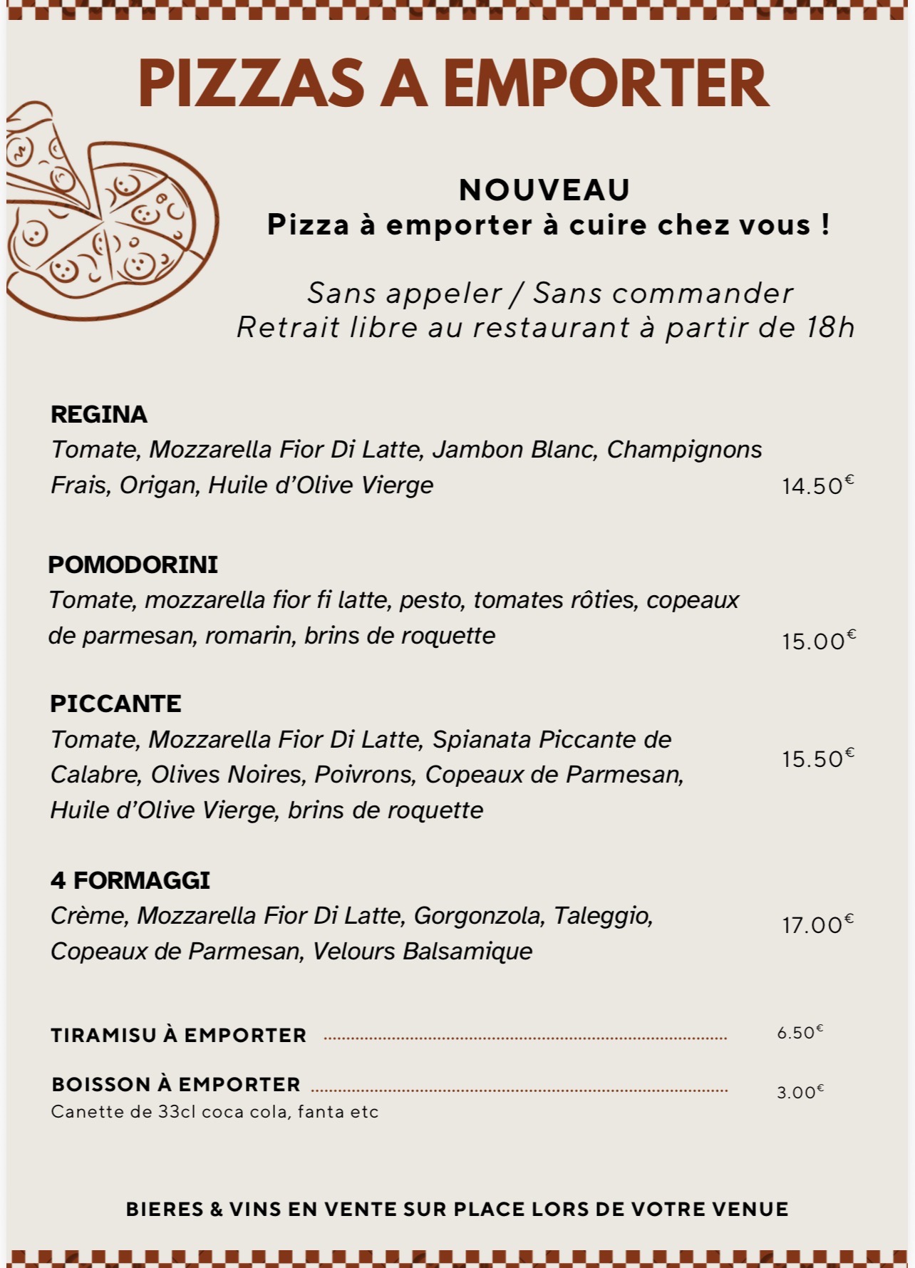 À emporter, nos pizzas sont disponibles prêtes à déguster ou à cuire chez vous, sans commande préalable entre 18h et 19h30.